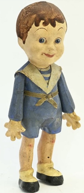 Récemment, dans une brocante, ce personnage a attiré mon attention car je me souvenais l’avoir découvert sur votre site. Celui-ci est habillé en marin, mais il est tout aussi jovial que les autres “bambins César” et semble avoir beaucoup joué.