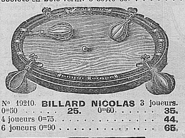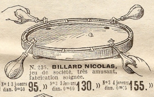 Le billard Nicolas est un jeu d’adresse dont le brevet à été déposé par Nicolas Redler en 1894 et fabriqué par Jean-Anatole Jost à Paris à partir de l’année suivante. Ce jeu de plateau en bois, aussi connu sous le nom de “Soufflo”, est un classique des jeux de société particulièrement en vogue au début du XXe siècle.