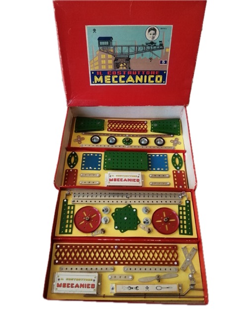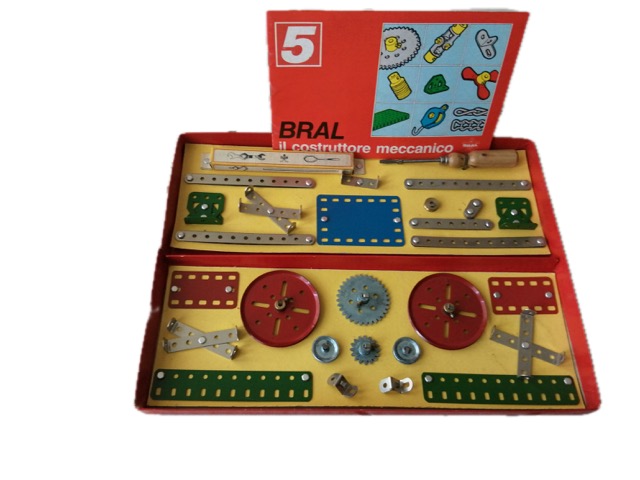 — Bral Meccanico, très inspiré par Meccano, a produit un jeu de construction métallique dont le coffret à trois niveaux présenté ici est le plus complet. Bral est la signature commerciale de Roberto Braglia qui fonda une atelier d’outillage et de jouets en tôle à Milan en 1902. Le succès commercial remporté par ses jeux de constructions métalliques, permettront à Bral d’entreprendre la construction de jouets plus luxueux et de se lancer sur le marché du train électrique en 0 dans les années 1950.