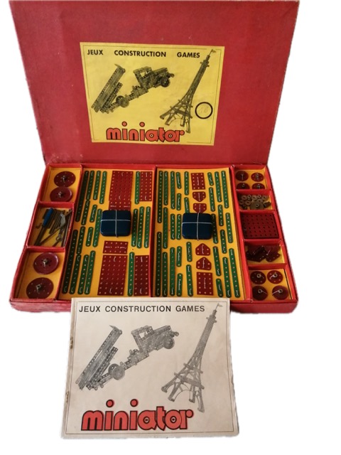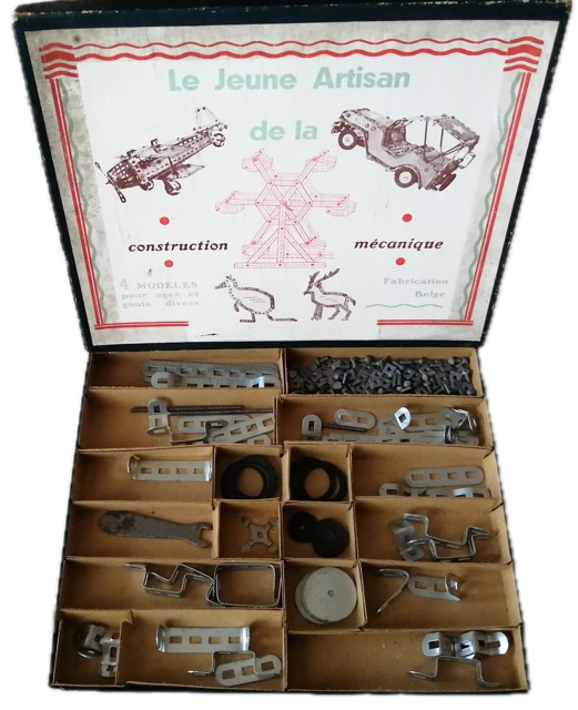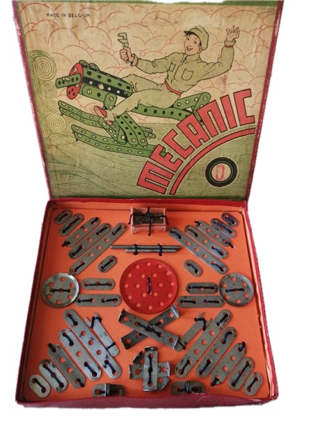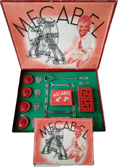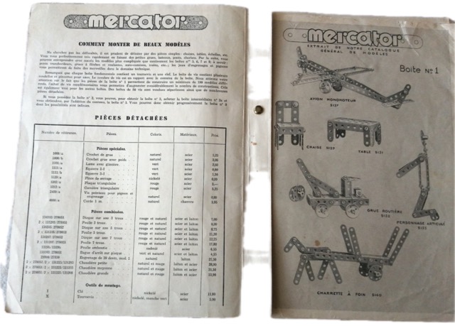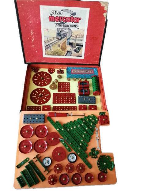 — Mercator, le fabricant bruxellois, a proposé 8 boîtes de pièces (coffrets numérotés de 1 à 8) aux “petits constructeurs” pour des “possibilités infinies”, dixit le manuel d’instructions, dans les années 1940. Le diamètre des axes est de 4,95 mm et l’espacement des trous de 13 mm. Couleurs : vert, rouge et gris.