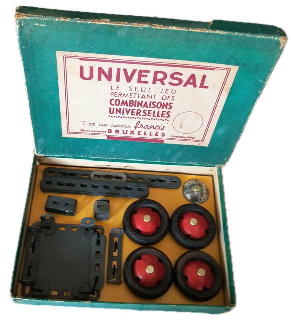 — Universal, création Francis, fabricant à Bruxelles dans les années 1940-1950. le diamètre des axes est de 3,6 mm, l’espacement des trous de 12,5 mm et les couleurs zinc et rouge.