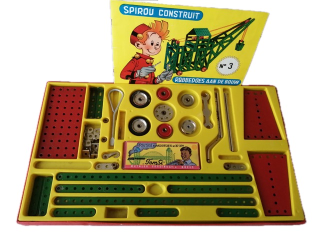 — Spirou construit (Robbedoes Aan De Bouw en flamand), inspiré de Meccano et de Märklin, ce jeu a été fabriqué sous licence néerlandaise Temsi entre les années 1950 et 1970. L’illustration de la boîte était un atout très attirant pour le jeune public belge et francophone fan du héros de leur journal de BD favori.