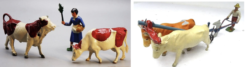 Fermière et son bétail et paysan et son attelage de bœufs.