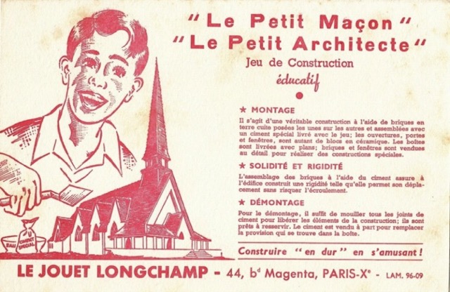 Ce jeu de construction était-il inspiré du jeu anglais similaire inventé en 1938 par J. W. Spears & Sons de Enfield au nord de Londres, le “Brickplayer” ? Ces jeux disparaîtront au milieu des années 1960 au profit de Lego d’un maniement plus simple et moins salissant.