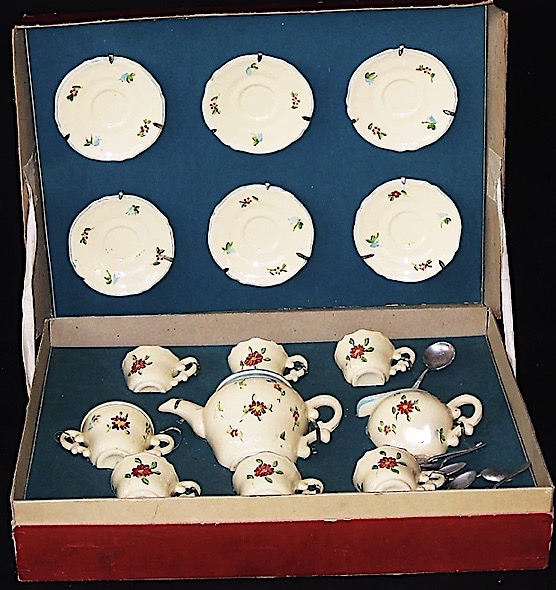 Le contenu des coffrets est très variable, tant en nature des pièces de faïence que du type de leur décor, liseré doré, fleurs diverses dont “Bluets” (sic).