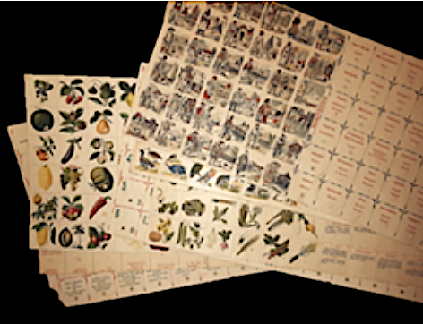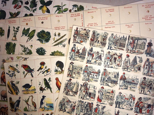 À l’intérieur du coffret il y a dix planches de questions/réponses en carton fort perforé. Les questions sont pour la plupart des images avec des thèmes divers : les habitations, les fleurs, les oiseaux, les charades et même il y a une planche en anglais ; les conundrums c’est-à-dire les énigmes. L’ensemble est en parfait état de conservation.