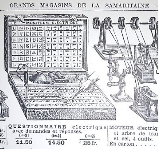 Cette carte est un exemple, comme l’Électro-Tutor, de ces jouets utilisant l’électricité dans un but d’enseignement. En général, ces derniers étaient plutôt des coffrets comme celui d’un jeu appelé Le questionnaire électrique avec demande et réponse vendu pour les étrennes de 1913 par La Samaritaine.