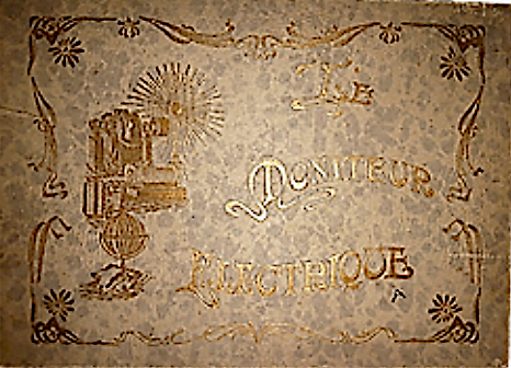 Notre coffret mesure 41 x 30 x 11 cm. Son décor de style Art nouveau est caractéristique de cette société avec, marqués en grosses lettres dorées, Le Moniteur électrique et en petites lettres demandes et réponses avec sur le côté gauche des représentations d’instruments scientifiques.