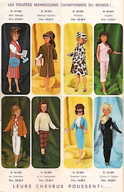 D’autres poupées mannequins suivront, des plus petites comme Snouky (25 cm) aux plus grandes telles Leslie (60 cm) ou Betsie (55 cm). Cathie, la grande sœur de Tressy, mesure 48 cm. A partir de 1972, son copain Jerry ne la quittera plus.
