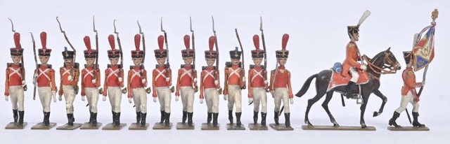 900 € Lucotte ronde-bosse 55 mm Ier Empire, régiment suisse au défilé, shako et plumet rouge : 10 officiers à cheval, 1 officier à pied sabre au clair, 1 drapeau, 1 fantassin avec hallebarde et 10 fusil sur l’épaule, 14 pièces au total, bon état.