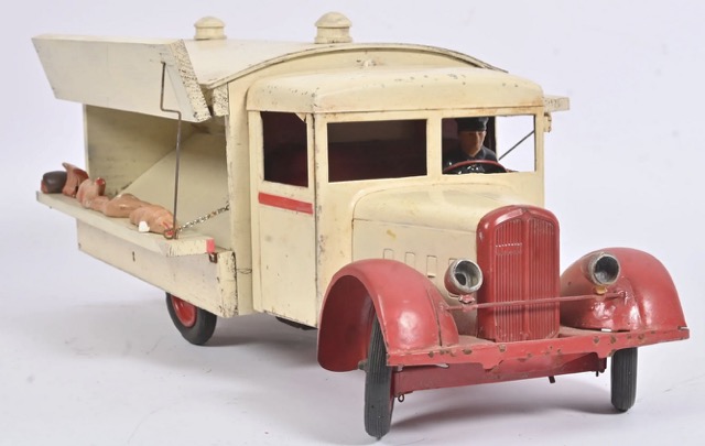 1300 € CIJ Renault, “Au cochon rose”, camion commercial avec cabine en tôle crème à filet rouge, mécanique avec éclairage, arrière en bois, côtés ouvrants et formant étal, pièces de viandes en plâtre, reproduction du chauffeur en plâtre, bon état d’usage, L. 52 cm.