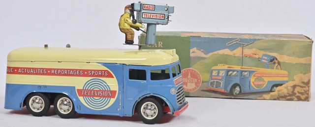 440 € Joustra, car de télévision mécanique (réf. 607) avec cameraman, 6 roues, en tôle lithographiée, manque l’antenne, boîte d’origine usagée, L. 30,5 cm.
