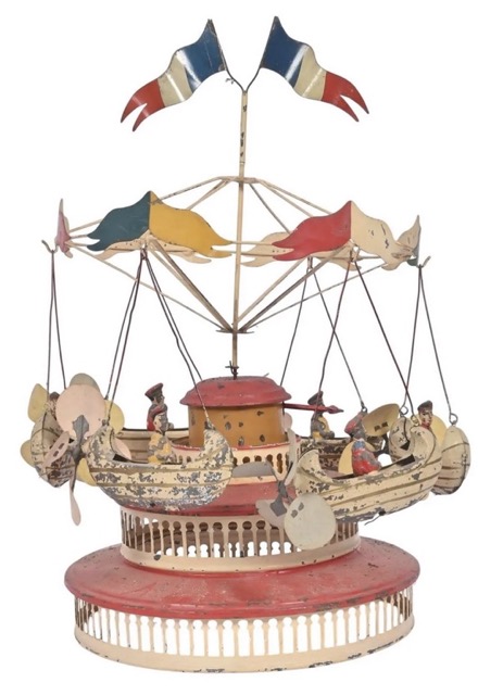 1000 € Müller & Kadeder, Allemagne, manège mécanique en tôle peinte rouge et beige, à six nacelles en forme de bateau avec personnage en tôle agrafée et hélices en carton, petites usures et écaillures d’usage, fonctionne, H. 40 cm.