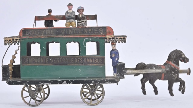 560 € Dessein (DS,,omnibus hippomobile Louvre – Vincennes en tôle peinte en vert, noir et rouge, avec deux chevaux et quatre personnages en métal, bon état d’usage, L. 29 cm.