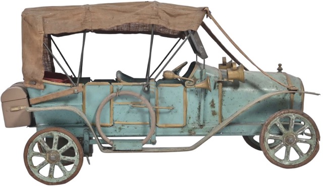 1800 € Pinard France, grande torpédo mécanique décapotableen tôle vert pâle à filet or, avec pare-brise et deux lanternes, très bel état grenier d’origine sauf écaillures et usures d’usage, fonctionne, L. 40 cm.