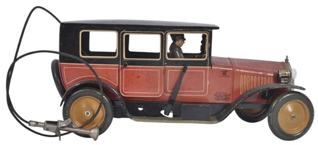 400 € Bing, conduite intérieure en tôle lithographiée rouge et noire, mécanisme avec éclairage, filoguidée, roue de secours, chauffeur, bon état, L. 34 cm.