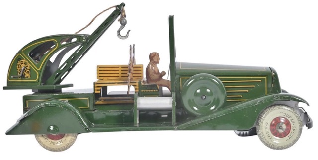 360 € CR (Rossignol & Roitel), Paris, 1938), dépanneuse Peugeot, en tôle lithographiée verte, mécanique, avec 3 personnages en tôle agrafée, immatriculée 1004, bon état, L. 36 cm.