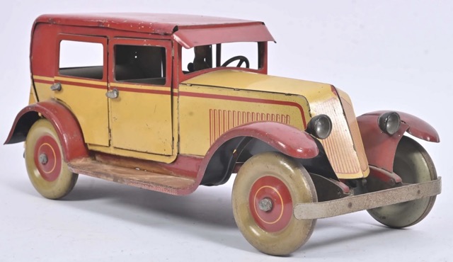 950 € Jep, grande berline Renault mécanique avec chauffeur, lithographiée rouge et jaune (réf. 7392), avec éclairage, portes ouvrantes, pare-chocs à l’avant, malle arrière prévue pour contenir une pile, roue de secours, marchepied abimé et quelques usures d’usage, L. 39 cm.