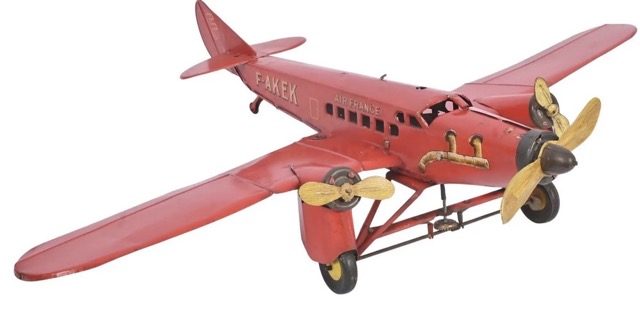 610 € Joustra, avion trimoteur F-AKEK, en tôle lithographiée rouge, hélices façon bois, ailes démontables, repeints et restaurations, L. 56 cm.