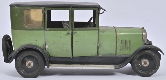 3400 € André Citroën, grande berline B14 mécanique avec éclairage au 1/7e, en tôle peinte en vert et noir, quatre portes ouvrantes, immatriculé 1375-U5, roue de secours, état grenier notamment vitres en mica coulissantes absentes, éclairage à revoir, chocs, écaillures et rouille, L. 54 cm