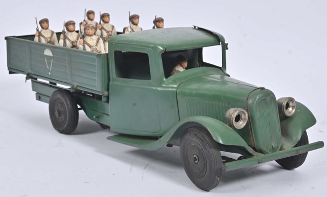 1000 € André Citroën, camion T23 “transport de troupes parachutistes”, en tôle verte, mécanique avec éclairage (mécanisme incomplet), avec un chauffeur et sept parachutistes en composition, usures d’usage, L. 47 cm.