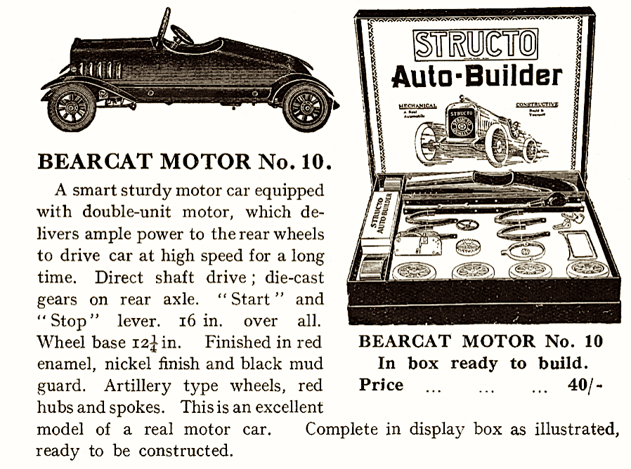 Le moteur à friction fut introduit pour réduire les coûts et les véhicules produits commencèrent à être assemblés en usine et non plus seulement fournis en kits. Les piles alimentant les phares firent aussi leur apparition. Structo Toys fut l’un des premiers fabricants de jouets à franchir le pas.