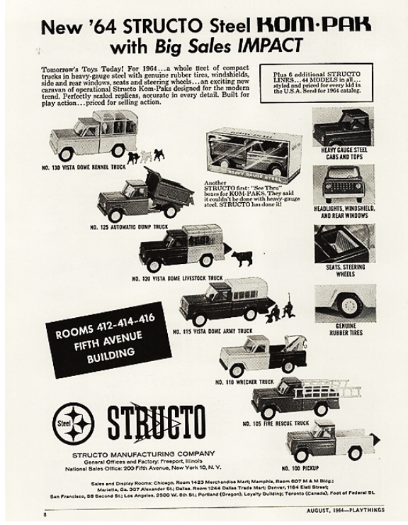 Dans les années 1960, Structo se lança une collection de véhicules utilitaires de 23 cm de long sous le nom de Kom-Pak.